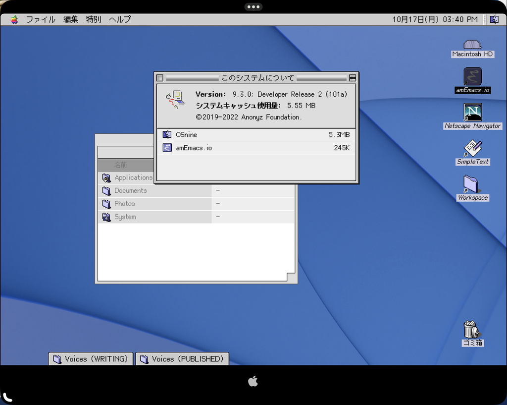 It took a long time though, now I think the development of the OSnine reached to the first milestone. Development itself is not the purpose actually, the purpose is to make what I want to use, so I have no idea what will be the next milestone. But I'm sure that I'm gonna keep using OSnine for a while, because articles of the Voice are written using a text editor called "amEmacs.io" running on the OSnine as well.